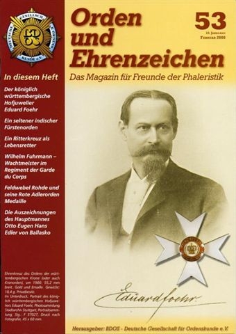 Das alle zwei Monate erscheinende Vereinsmagazin 'Orden und Ehrenzeichen' ist farbig gestaltet und enthält eine Fülle von Berichten über die Ordenskunde aller Epochen. Dabei werden interessante Zeitdokumente vorgestellt und diskutiert. Auktionsvorschauen und deren Auswertung sowie die Vorstellung neuer ordenskundlicher Literatur gehören mit zum festen Bestandteil des Magazins.