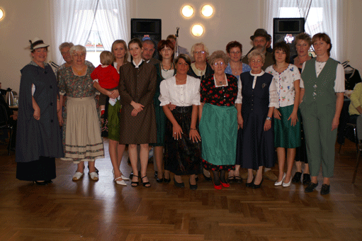Die Frauengruppe baute dann in liebevoller Arbeit, vielen Einzelaktivitäten und mit Hilfe einer ganzen Reihe von Sponsoren ein Angebot der Mode von 1897 bis in die heutige Zeit auf. Zu den ersten „Models“ gehörten L. Gürke, G. Leisdorf, C. Stert, I. Beer, F. Schmodter, E. Schwarz und G. Kleist. Dank großzügiger Spender konnten sich die Frauen nach und nach historische Kleider, Gehröcke, Herrenhemden, Unterwäsche, Schirme und Gehstöcke abholen. Die Modelle, die von unserer Modegruppe vorgeführt werden, bestehend aus Oberbekleidung sowie Nacht- und Unterwäsche, sind alles Originale.